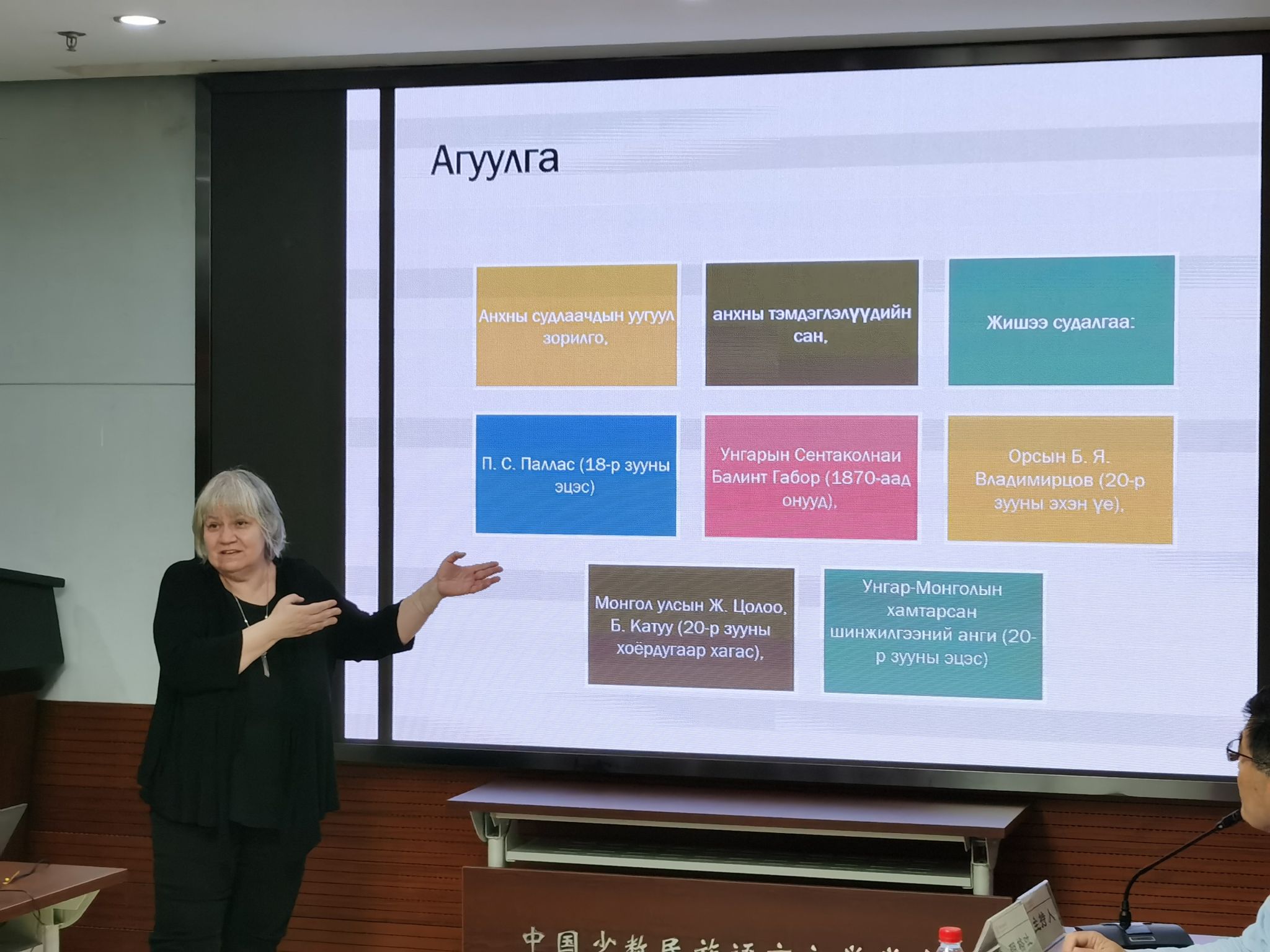 阿格尼希教授学术研究涉及蒙古文献、语言、民俗、传统文化、宗教以及朝鲜语言、宗教和满语等广泛领域。她在学术报告中介绍了十九世纪和二十世纪初匈牙利、德国、俄罗斯等国家学者在蒙古民俗、民间文学领域进行研究的深夜福利概况