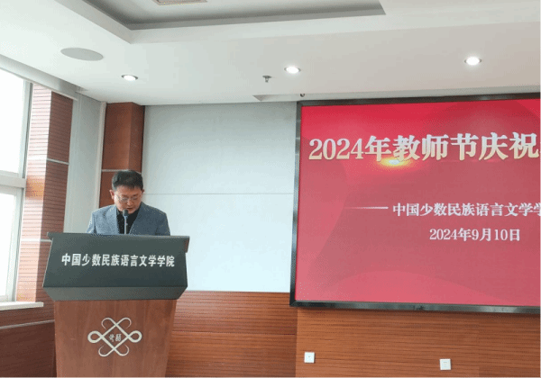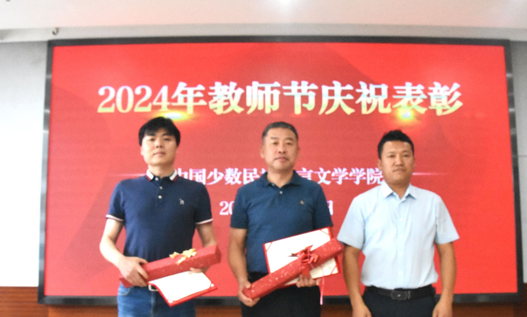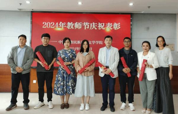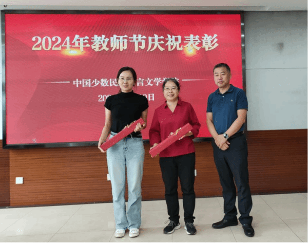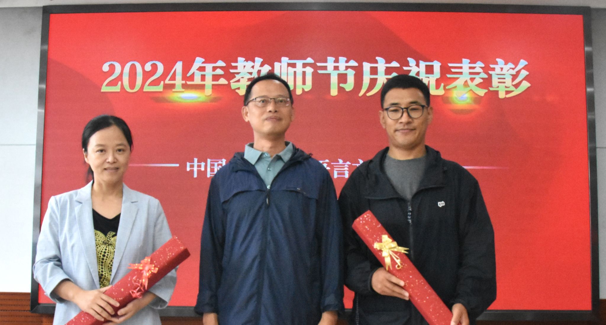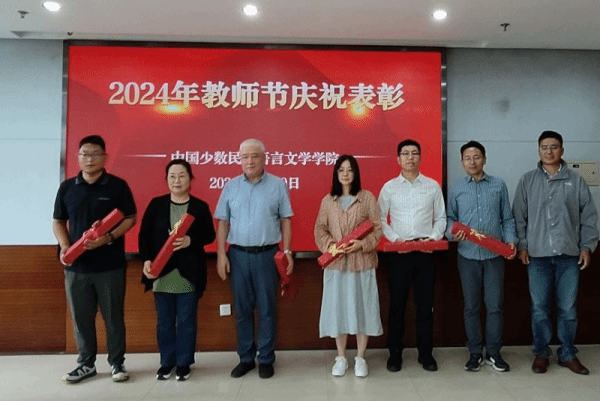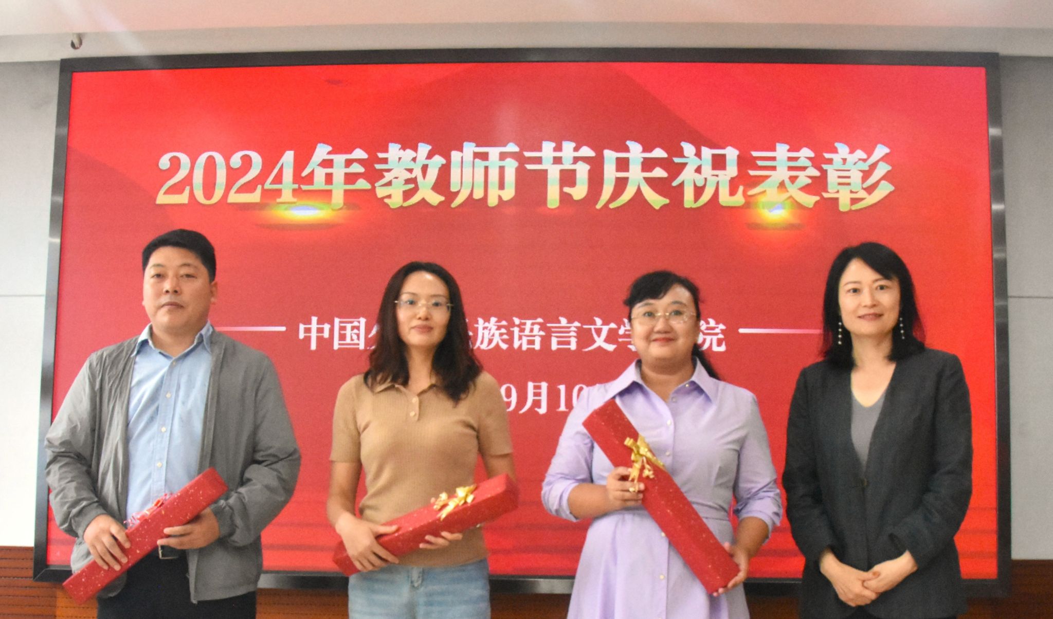 副院长金青龙、王利萍和副书记仁乃杰分别宣读表彰名单,学院领导、党委委员、教授委员会和教代会委员分别为获得国家一流本科课程、国家通用语言文字推广普及先进个人、北京高校优质课程、北京市大学生人文知识竞赛突出贡献奖、北京市优秀学位论文指导教师,参加上级单位各类工作和学校外派培训工作等方面表现优秀的教师颁发证书。