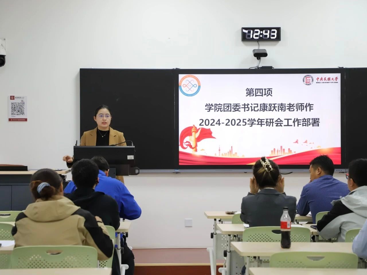 会议第四项,学院团委书记康跃南对第六届研会工作做整体部署。她指出研究生会工作首先要统一思想,明确方向,以铸牢中华民族共同体意识为主线,服务于学院的发展,以同学们的实际需求为出发点,切实举办求真务实的学生活动。其次她介绍了研究生会本学年工作重点与分工,并对近期工作开展进行了详细部署,鼓励大家要在活动策划、组织实施、宣传推广等各个环节上精益求精,力求创新,通过各部门成员的共同努力,让研会工作更加贴近时代、贴近学生。此外,康跃南老师指出研会成员还要严于律己,树立良好的形象,坚持公平公正,服务大局。